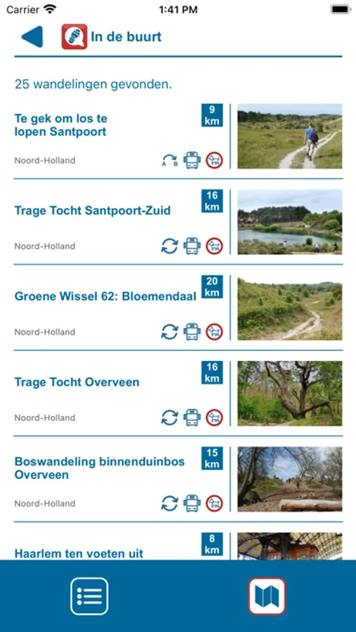 WandelZapp biedt een zoekmogelijkheid op afstand, plaats, naam, trefwoord en bereikbaarheid met openbaar vervoer. Ook is direct zichtbaar welke wandelingen er beschikbaar zijn in de buurt op basis van de locatie van de smartphone.