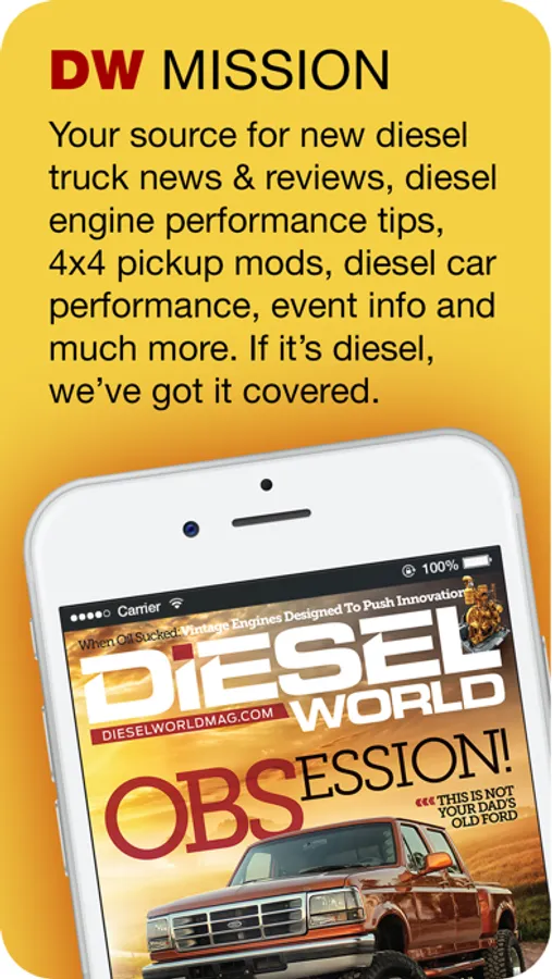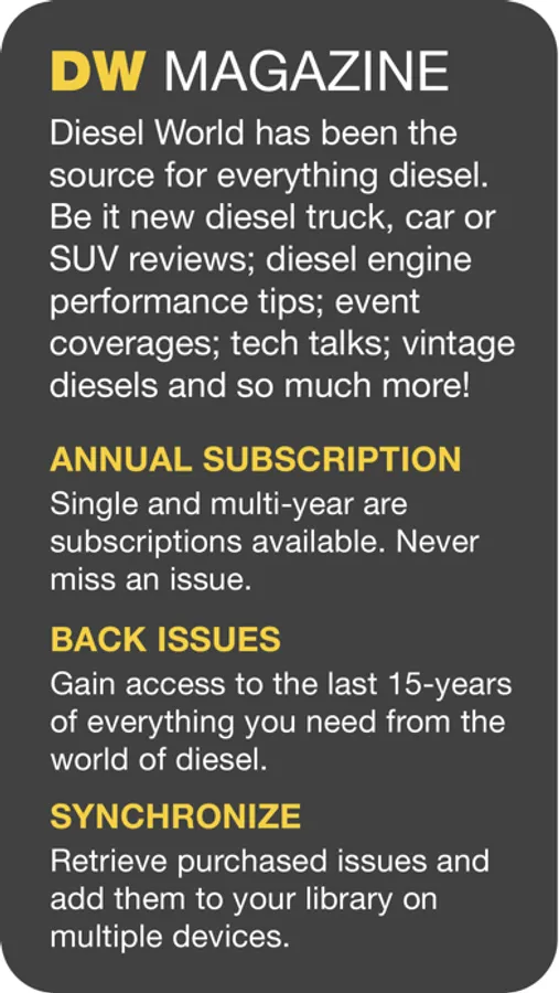 Diesel World Magazine is the only automotive publication on the market today that covers the complete diesel-powered market, from diesel engines and trucking news, right down to the latest diesel-powered cars. Enjoy the Diesel World app that delivers digital mag content in an exciting format. And as mobile magazines go, you can take your favorite turbo magazine with you on your chosen device with this app. Diesel World is a one-stop-shopping resource for discovering what’s new in the market place, learning about the hottest new parts and accessories, and seeing how these products can improve your diesel ownership experience by improving power, mileage and longevity. The magazine offers in-depth road tests and evaluations on diesel-powered autos—both cars and trucks, along with all of the latest news on which new diesel vehicles are coming to the U.S. market and what to expect in terms of fuel economy. The editors of Diesel World are seasoned automotive journalists, who, each month, bring insightful tech articles, spectacular feature layouts and awesome event coverage of the world of diesel motorsports, which includes drag racing, sled pulling and dyno competitions. They are hands-on enthusiasts who can make even the most difficult technical subject into a story from which the average diesel owner can learn and benefit. Fuel your passion for all things diesel. With Diesel World.