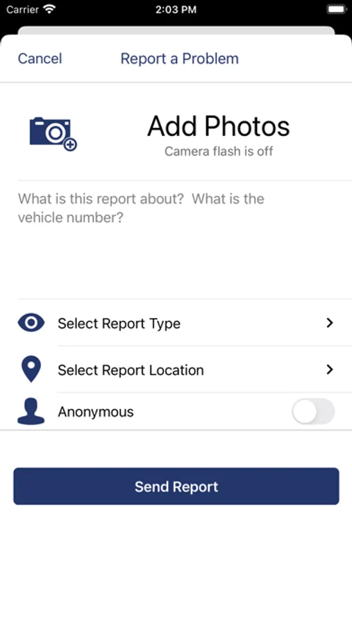 1. The “Report a Problem” button allows riders to send text or photos directly to VTA Security. To ensure discretion, the camera flash is automatically disabled when photos are taken through the app. Riders can select station locations and report categories to assist VTA Security. Riders can also send reports anonymously if they choose. If you send a report in an area without cellular connectivity, it will be stored and sent when connectivity returns. The system is also designed to send the message before pictures so that VTA Security can get App reports as quickly as possible.