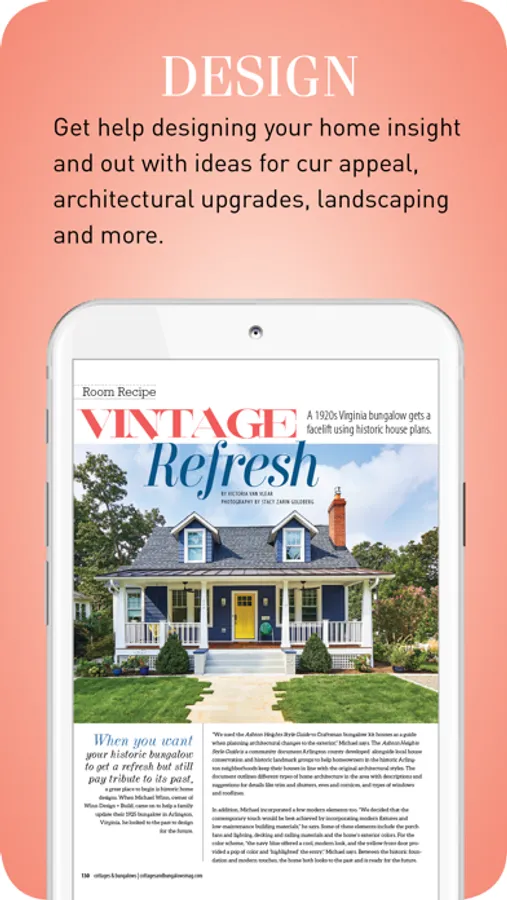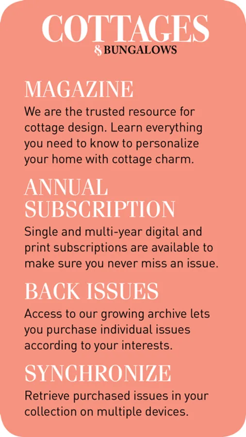 Cottages & Bungalows is a unique cottage-style magazine packed with inspiring home décor ideas. From a beach cottage to a country coastal bungalow, you’ll find all the interior design tips and advice for decorating your home. Also get great designer ideas for managing space and room decoration for a small home. With great DIY projects, you can now create a cottage lifestyle in any home. And the bestselling Cottages & Bungalows app delivers all this exciting content in a convenient digital magazine subscription. Created to appeal to cottage-style enthusiasts, Cottages & Bungalows focuses on houses built from the 1890s to recently built homes that capture the cottage look. Styles include everything from beach cottages to traditional Craftsman bungalows to English Tudor and fresh, modern styles.