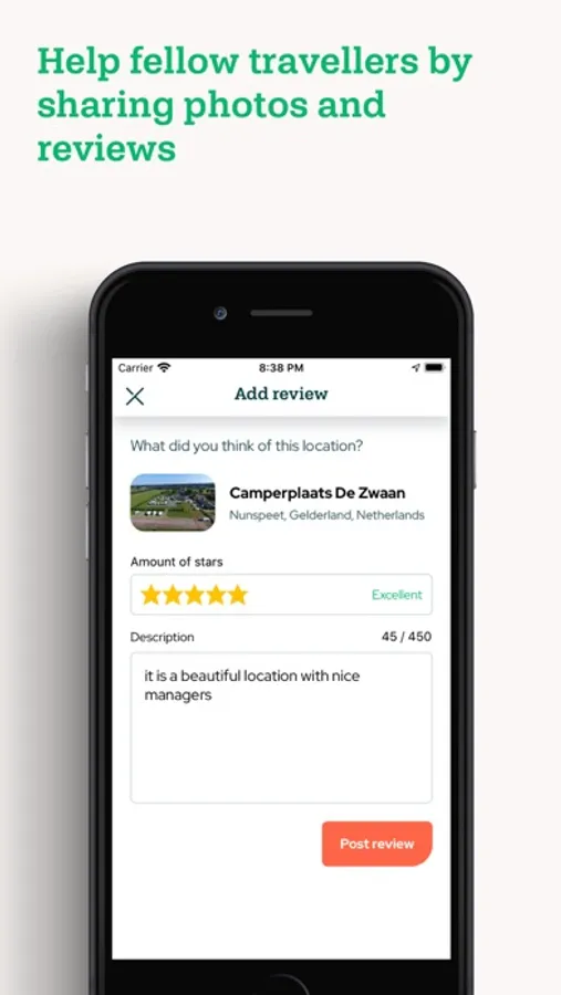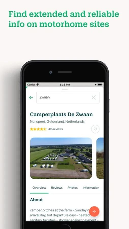Easily add new reviews, photos, and motorhome sites to the app yourself. Or share a motorhome site with your friends via WhatsApp, email or social media.