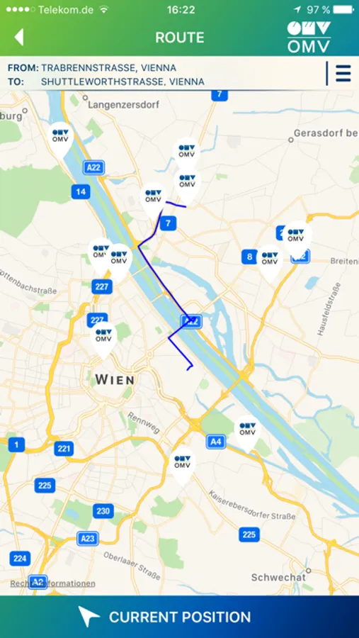 - indication of route with all OMV filling stations, including distance