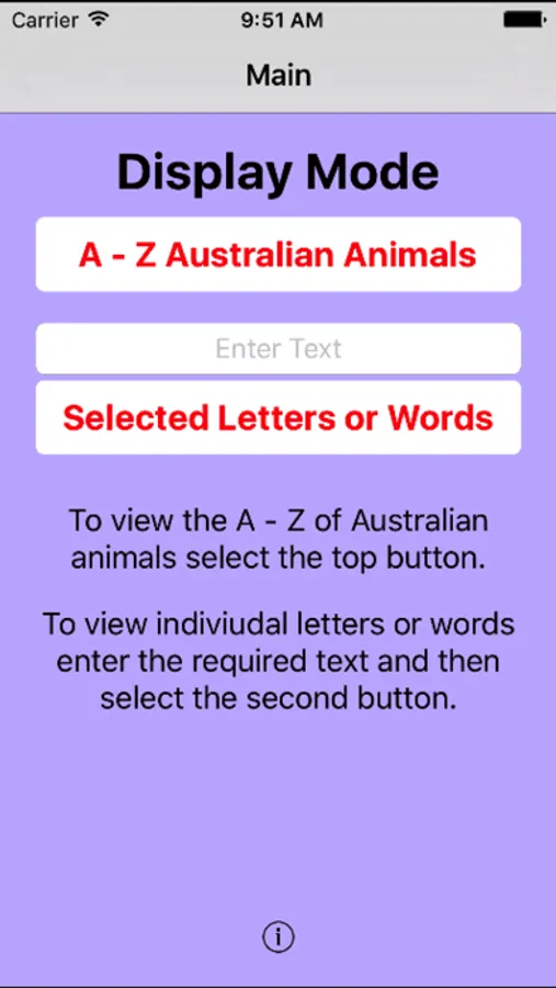 ‘Australian Animal Alphabet’ is an app designed to display an Australian animal for each letter of the alphabet. You have the choice of displaying the full alphabet letter by letter or displaying entered letters or text. The app gives you the ability to set the rate at which it will display individual letters.