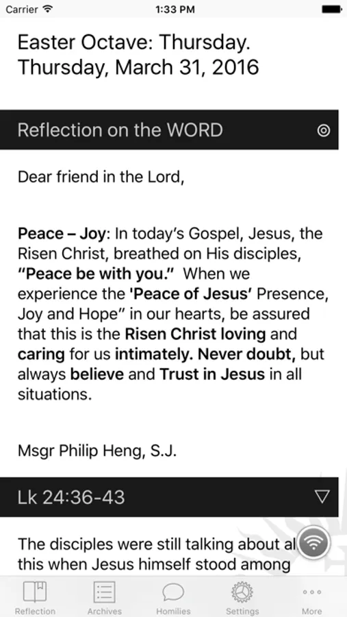 The app contains the Gospel passage for the day, following the Catholic liturgical calendar, and also a short reflection written by Msgr Philip Heng, S.J. This app is an initiative of the Jesuit Prayer Ministry.