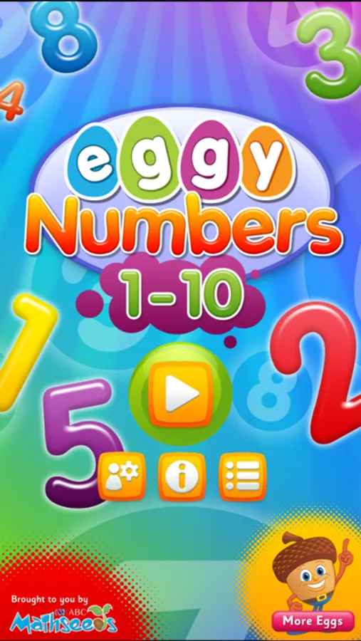With its hands-on activities, engaging animation and motivating rewards, Eggy Numbers 1 - 10 provides a rewarding learning experience for young children. Buddy the Acorn will guide your child and help them stay motivated to collect 18 new critters and 138 golden acorns!