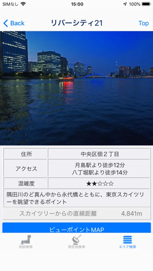 地図からビューポイントを検索します。地図上のアイコンをタップすると、ビューポイント名が表示されますので、そこをタップするとビューポイント情報が表示されます。