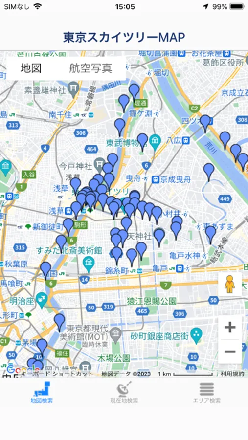 位置情報サービス(GPS)から現在地を取得し、現在地に青のピンが表示されるとともに、そこを中心に地図を表示します。地図上のアイコンをタップすると、ビューポイント名が表示されますので、そこをタップするとビューポイント情報が表示されます。位置情報サービスがオフとなっている場合には、東京スカイツリーを中心に地図を表示します。