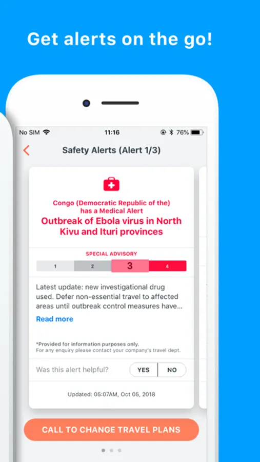 • Itinerary specific safety alerts, find destination-related health and well-being information and check-in during a major incident