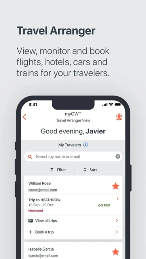 Make your job easier by managing travel from the convenience of myCWT. Manage and book flights, hotels, car rentals and train reservations, stay updated with alerts on flight delays and other disruptions. Share trip details with travelers and get real-time notifications that will help you anticipate schedule and reservation changes.