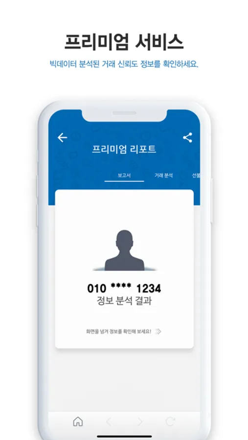 3. 프리미엄 검색을 통해 선불폰 국번호 여부 및 거래 안정성(비금융 신용정보)을 확인할 수 있습니다.