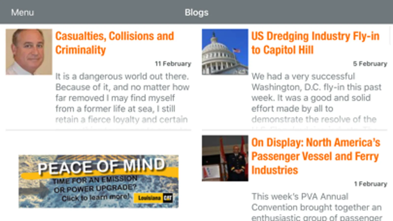 Get instant updates on shipbuilding, contracts, technology, legal issues, and business innovations- organized for mobile users. Customize your information by choosing one or more categories: People & Company News, Shipbuilding, Offshore, Finance, Government Update, Education/Training, Casualties, and Logistics. One touch brings you the latest business news- and check out the blogs for insightful commentary from industry experts and analysts.