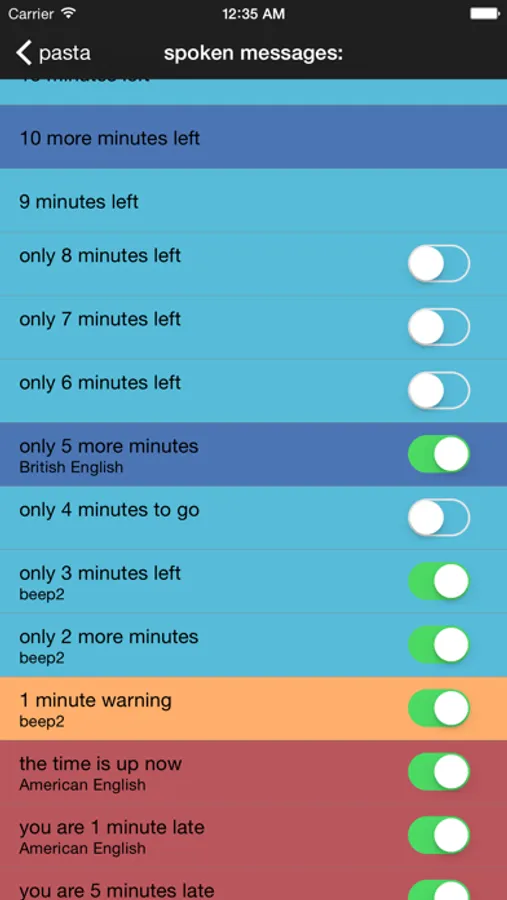 . turn on/off and select the spoken languages for each of the 18 announcements for each 'food'