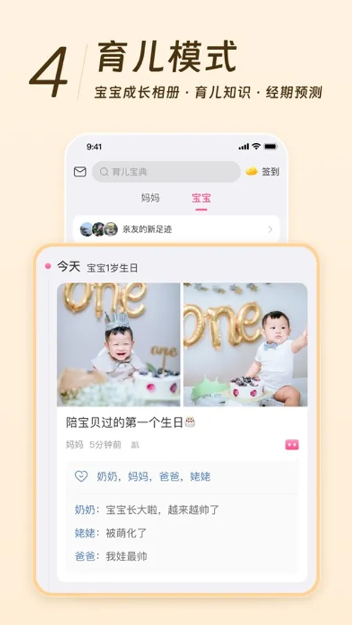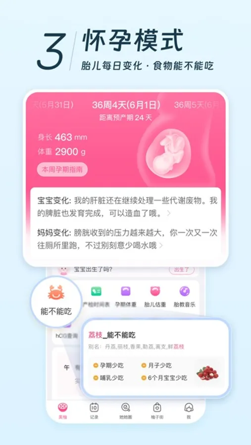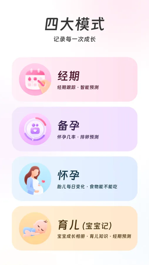 提供经期、备孕、怀孕、育儿四大模式。科学备孕,排卵日一查便知;健康怀孕,知识每日推送,食物能不能吃一查便知;育儿护航,记录宝宝成长每一刻。