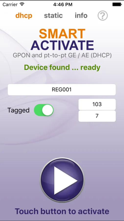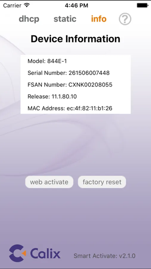 The Smart Activate app is designed to work with the Calix 7xxGE optical network terminals (ONTs) and 8xxGE residential services gateway (RSGs). Simply connect a local access point (AP) to the ONT / RSG, join the Wi-Fi network, and launch the app. The Smart Activate app will automatically find the 7xxGE ONT / 8xxGE RSG, allowing you to simply enter the registration ID and touch the activate button.
