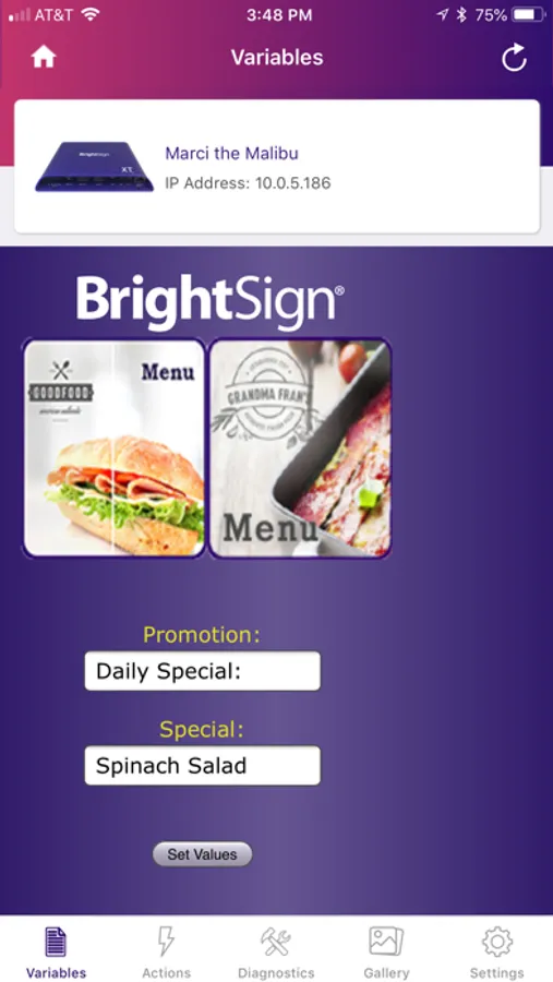 Control and manage your BrightSign digital signage media player directly from your iPad or iPhone. Select any BrightSign player connected to the local network, and then use your mobile device to change user variables for the current presentation, or to trigger presentation events and transitions.