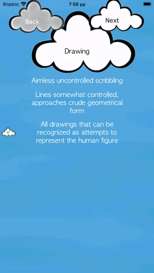 When the painting is complete start the evaluation answering a set of standard questions regarding shape, proportions and other details to describe the picture. Just press on the appropriate text boxes to make your selections and press again to deselect. Use the “Back” and “Next” clouds to go back and forth.