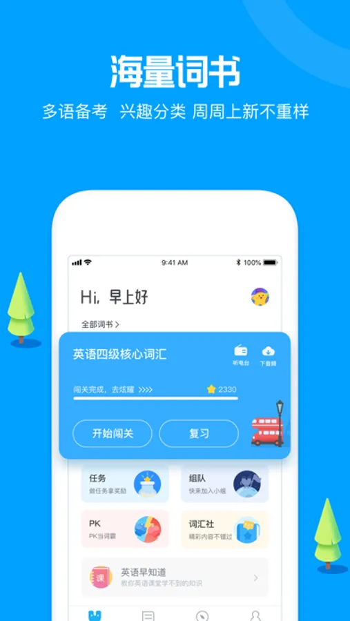 游戏化背词体验,好友PK大战,排行榜激励机制,社团讨论吐槽…在这里背词,除了收获更好的自己,最重要的是你还会很开心!