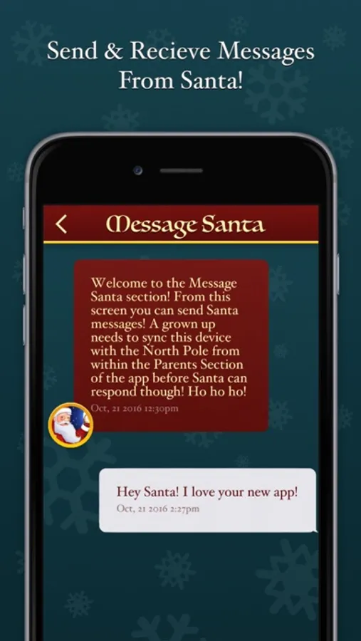 MESSAGE SANTA - Send Santa messages! Receive messages from Santa! *Parents can use the Message Santa functionality to keep children well behaved! REQUIRES PARENTAL SETUP*
