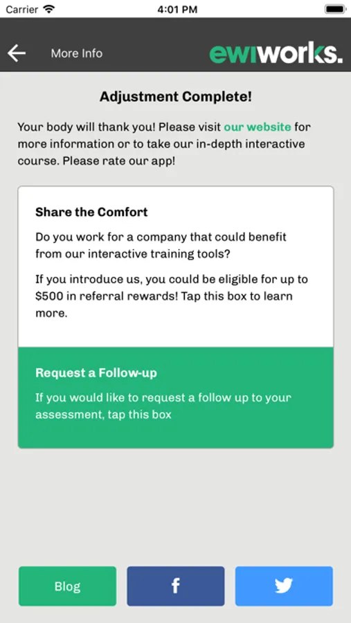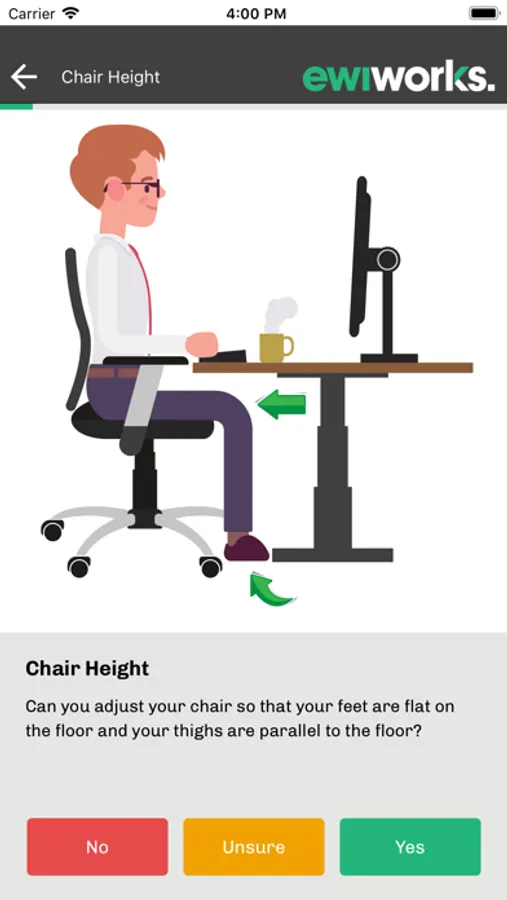 Every day at EWI Works Inc. we see the discomfort and injury resulting from poorly adjusted workstations, this discomfort is totally preventable with the right set-up. Developed in collaboration with a team of highly trained professional certified ergonomists, this app is intended to make basic ergonomic know-how accessible to everyone in a convenient affordable and easy to understand format. Thanks for your interest!