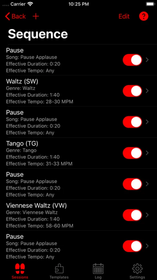 - Create your own custom sequence of dances, pauses and intervals
