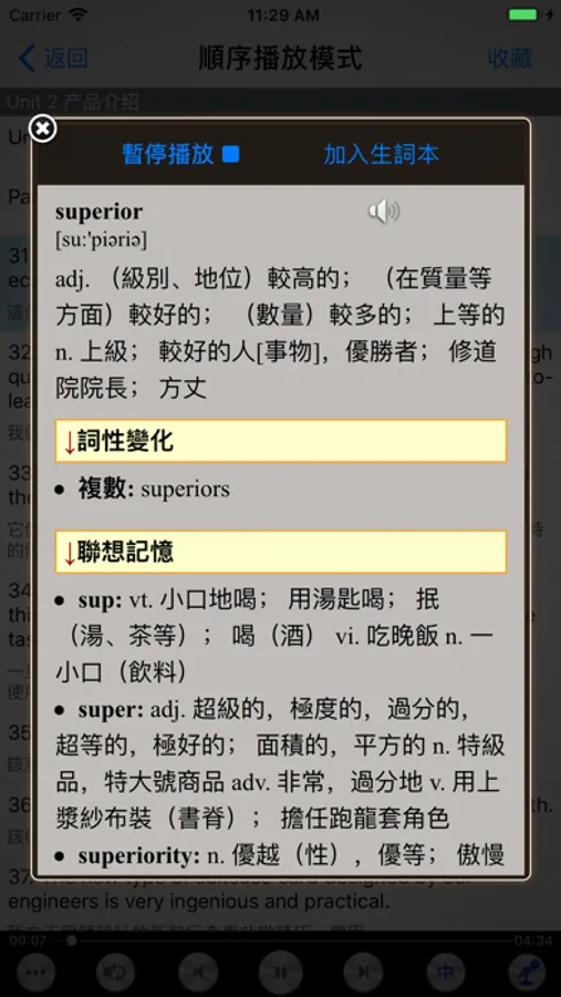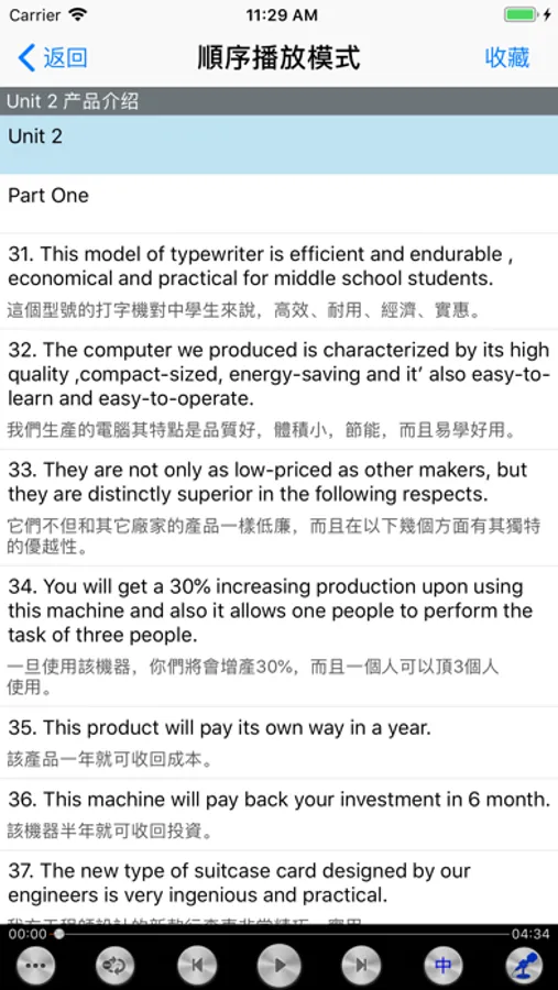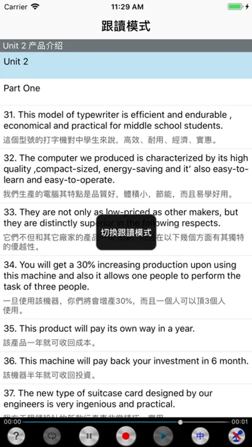 3、多种播放模式选择:单句循环、单课循环、课程连播、对比播放、是否显示中文译文播放等等,适合各种学习模式,能帮你迅速提升英文听力能力