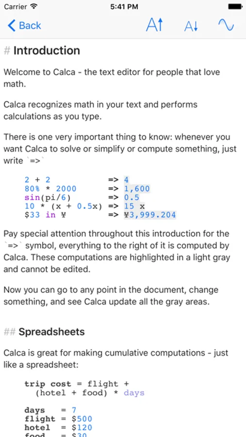 Calca updates as you type - just like a spreadsheet. You can declare variables, edit their values and watch everything update before your eyes. Since everything is calculated on the device - no network needed - you get answers instantaneously.