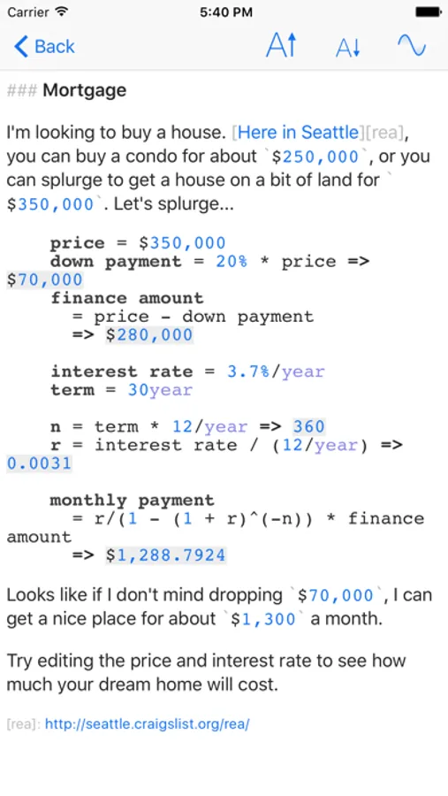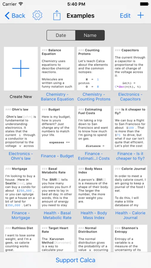 Calca comes with a suite of examples to help you get started covering topics from home mortgages to kinetics. All these examples are fully explained within Calca itself.