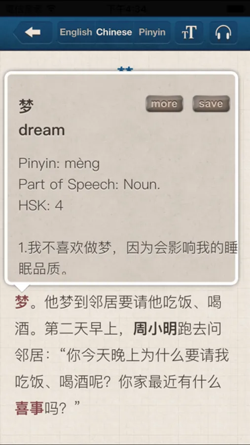 1.Click on a colored words, and we will show you its English definition, pinyin, part of speech, sentences, and its HSK/TOP level.