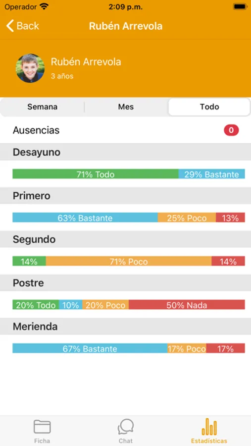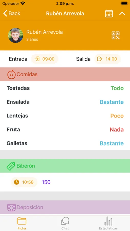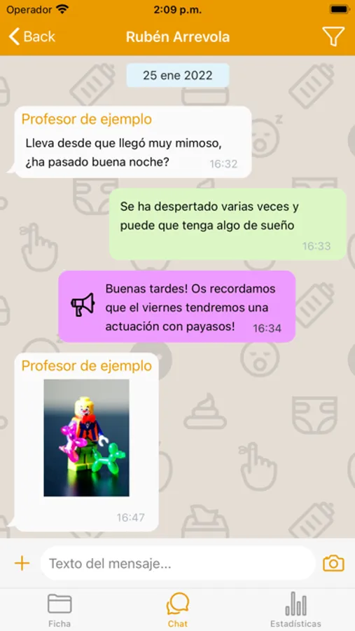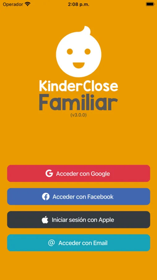 Esta es la aplicación KinderClose para Familiar (fondo naranja). La aplicación para Profesor (fondo blanco) también está disponible y se puede descargar de forma gratuita.