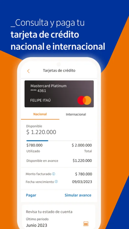 Gestión integral de tarjetas: toma el control de tus tarjetas de crédito. Revisa las transacciones en detalle, realiza pagos nacionales e internacionales con facilidad y consulta los montos facturados que puedes pagar en cuotas. Además, solicita avances en efectivo, bloqueos temporales y definitivos.