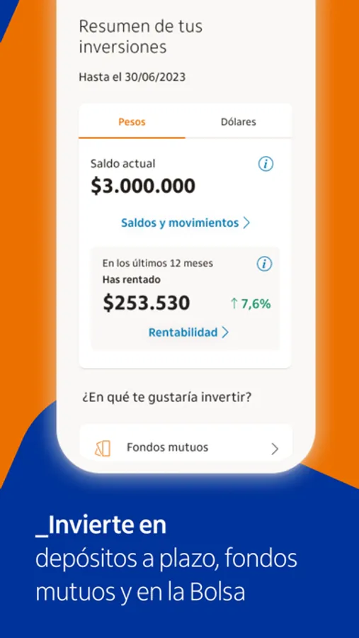 Administra tus inversiones con confianza: controla tus fondos mutuos, depósitos a plazo y APV desde tu App. Visualiza la rentabilidad de tu cartera consolidada y haz traspasos entre fondos con facilidad.