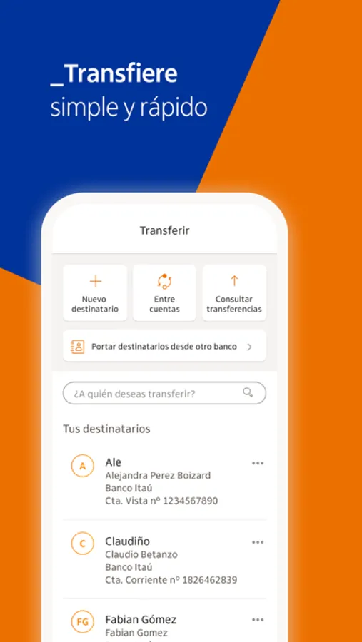 Transferencias más simples: realiza transferencias entre tus cuentas y a terceros en pocos pasos. Además, puedes traer tus contactos desde otros bancos para agilizar tus transacciones.
