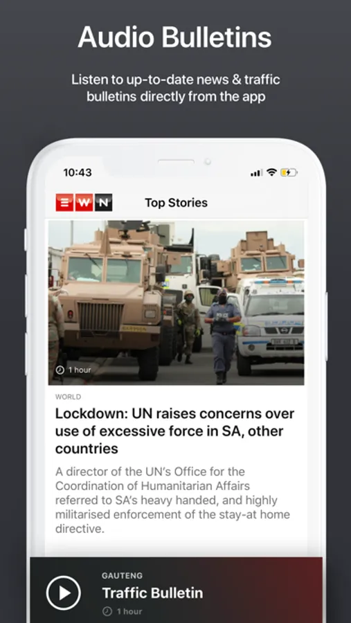 Eyewitness News is an independent, award-winning South African news organisation, accessible through http://ewn.co.za and on 702, CapeTalk, 947 and KFM. EWN reporters, photographers and videographers are based in Johannesburg and Cape Town and travel wherever the news is happening. EWN also has a string of correspondents across the country and in major cities around the world.