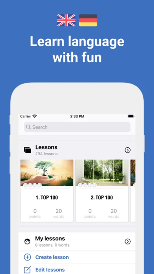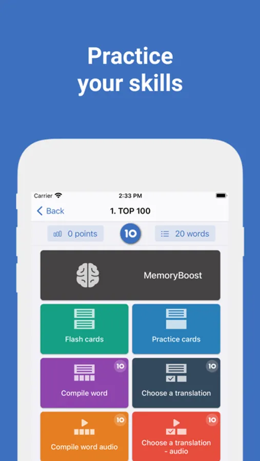 Our unique algorithm improves the learning process, using proven methods from the field of memory research. Words adapts individually to you, selectively repeats the words with which you had problems. Completing lessons and playing games, you will gain experience, move to higher levels and collect rewards.