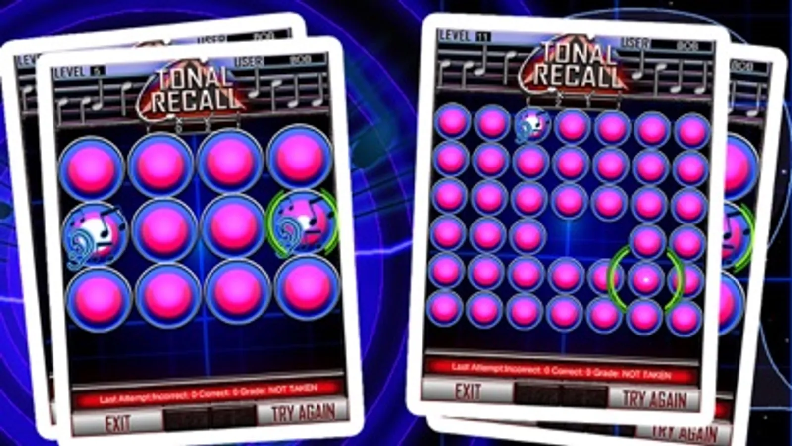 In Tonal Recall mode, you progress from the easiest level to the final crazy level. You can listen to each item once to memorize it. Four users can keep track of their high scores in Memory Mode.