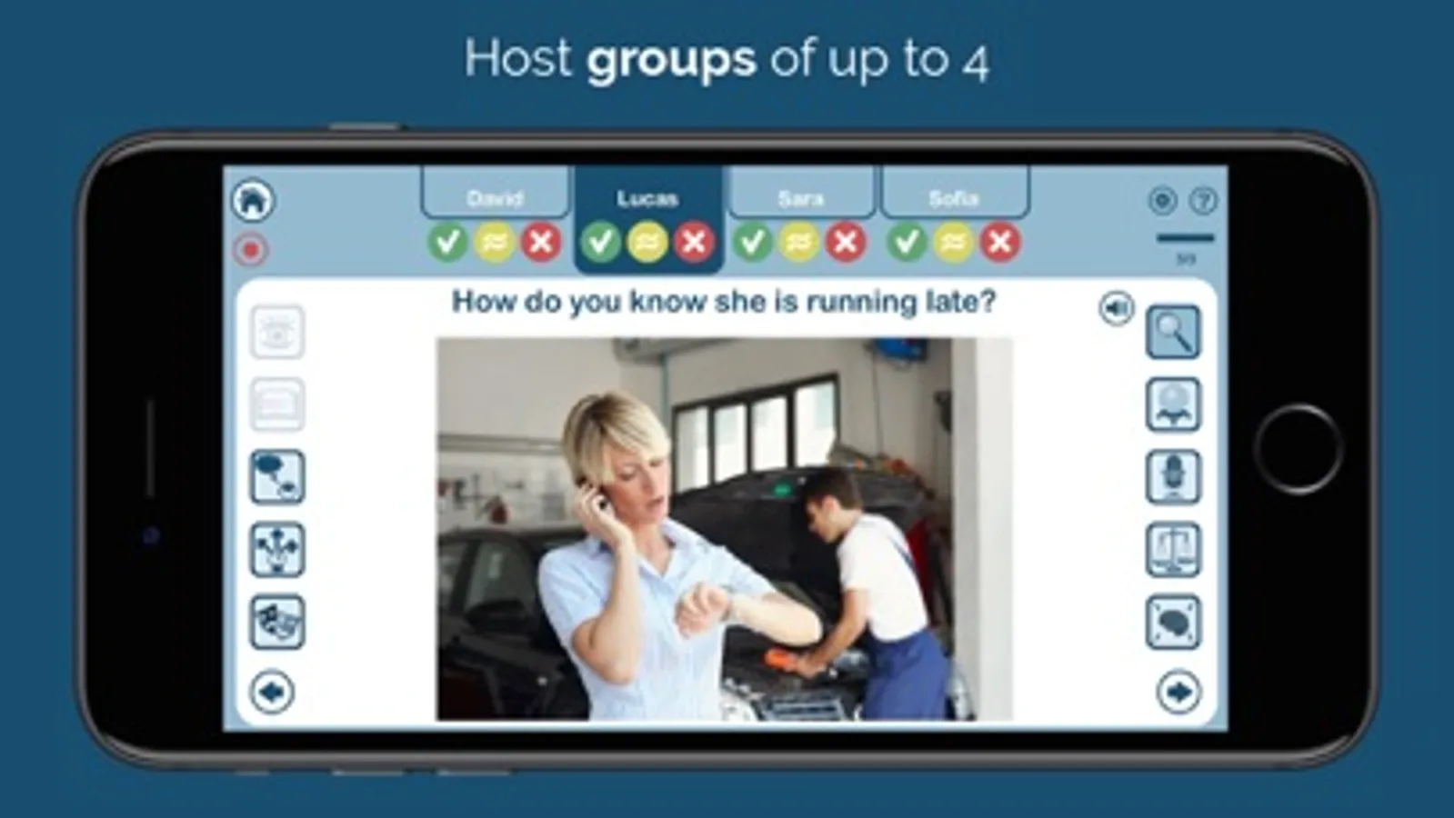 - Talk one-on-one, host groups of up to 4 at a time, and track improvement with ease