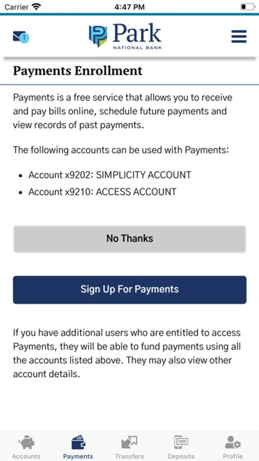 Park National Bank’s mobile banking app is the ultimate connection to your money – and it’s free! Enjoy an updated mobile banking experience with enhanced features and added services, plus the convenience of personal online banking, all at your fingertips. After downloading the app, login with your online banking ID and password.