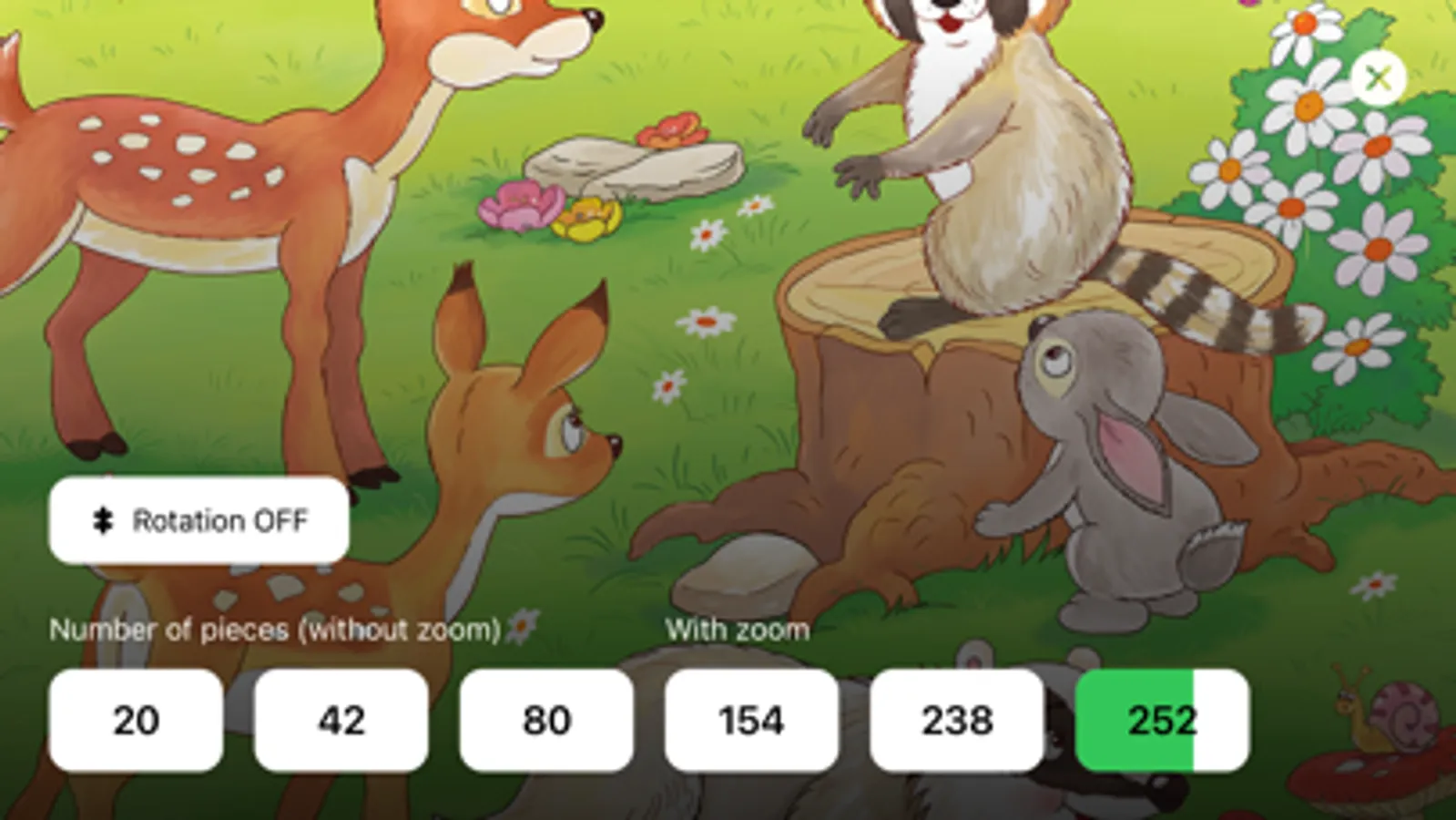 - 8 levels of complexity: from  20 pieces up to 1110 pieces, available for any puzzle;