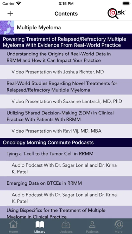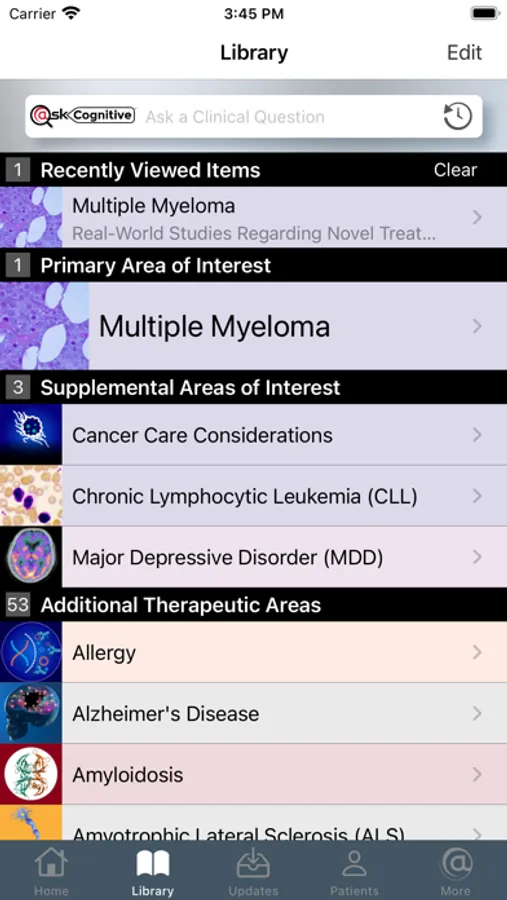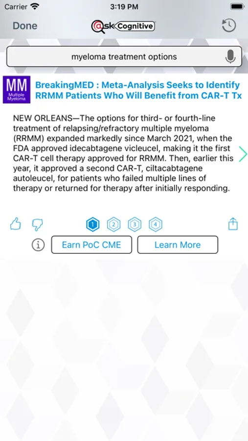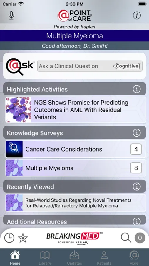 @Point of Care™ With Cognitive AI is a clinical decision-making mobile platform. Multiple Myeloma @Point of Care™ provides a streamlined clinical decision support tool for clinicians to obtain content when it is needed—enabling better decisions, better outcomes, and better care.