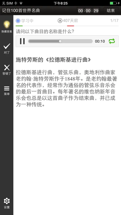 《记住世界名曲100首》依托易呗记忆和云存储引擎,针对音乐播放特别优化,在获得世界名曲带给我们艺术享受的同时,轻松自然地了解和记住这些世界音乐瑰宝。