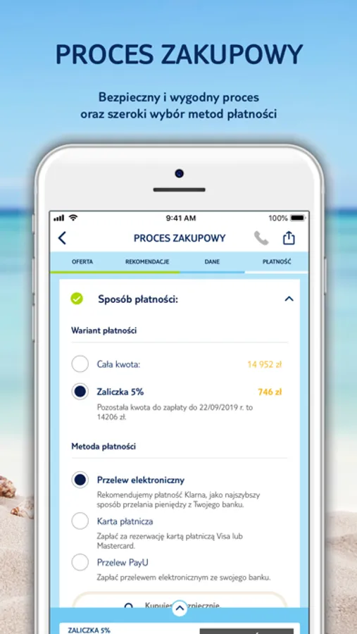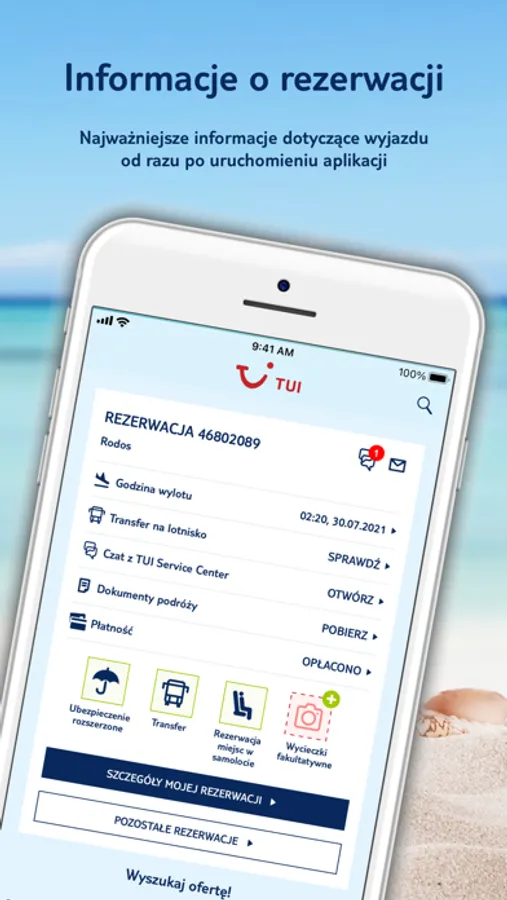 - wgląd do bieżących i historycznych rezerwacji wakacji, hoteli w aplikacji;