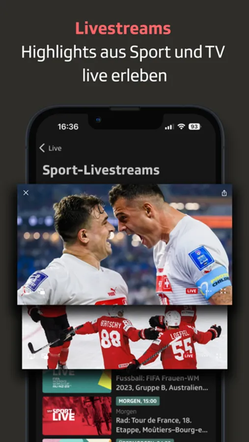 Mit der Play SRF App können Sie alle Highlights aus dem TV live miterleben. Verfolgen Sie alle SRF TV-Programme als Livestream – SRF 1, SRF zwei und SRF info. Und das ist noch nicht alles: Fiebern Sie mit der Play SRF App bei allen Sport-Highlights aus Fussball, Tennis, Eishockey, Ski und vielen weiteren Sportarten live mit. Streamen Sie zudem exklusive Sport Livestreams, welche nicht im TV ausgestrahlt werden.
