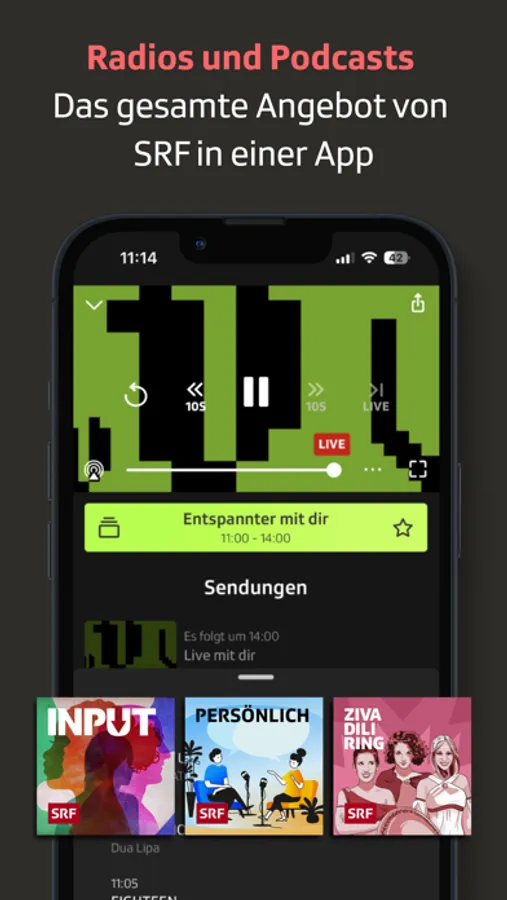 Entdecken Sie das gesamte Audio-Angebot von SRF in einer App. Wählen Sie aus mehr als 100 unterschiedlichen Podcasts wie «Echo der Zeit», «Persönlich», «Input», «Focus» und unserem vielfältigen Angebot an Hörspielen und Krimis. Für alle Radio-Liebhaber:innen stehen zudem alle SRF Radiosender als Livestream inklusive Timeshift-Funktion zur Verfügung: Radio SRF 1, Radio SRF 2 Kultur, Radio SRF 3, Radio SRF 4 News, Radio SRF Musikwelle und Radio SRF Virus.