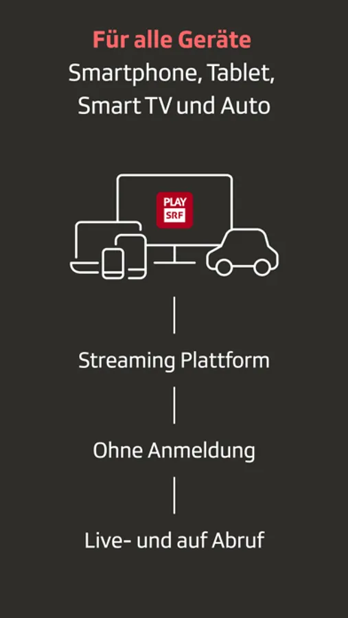 Die Play SRF App können Sie auf einer breiten Palette an Geräten nutzen: Smart TV, Tablet, Smartphone und sogar in Ihrem Auto.