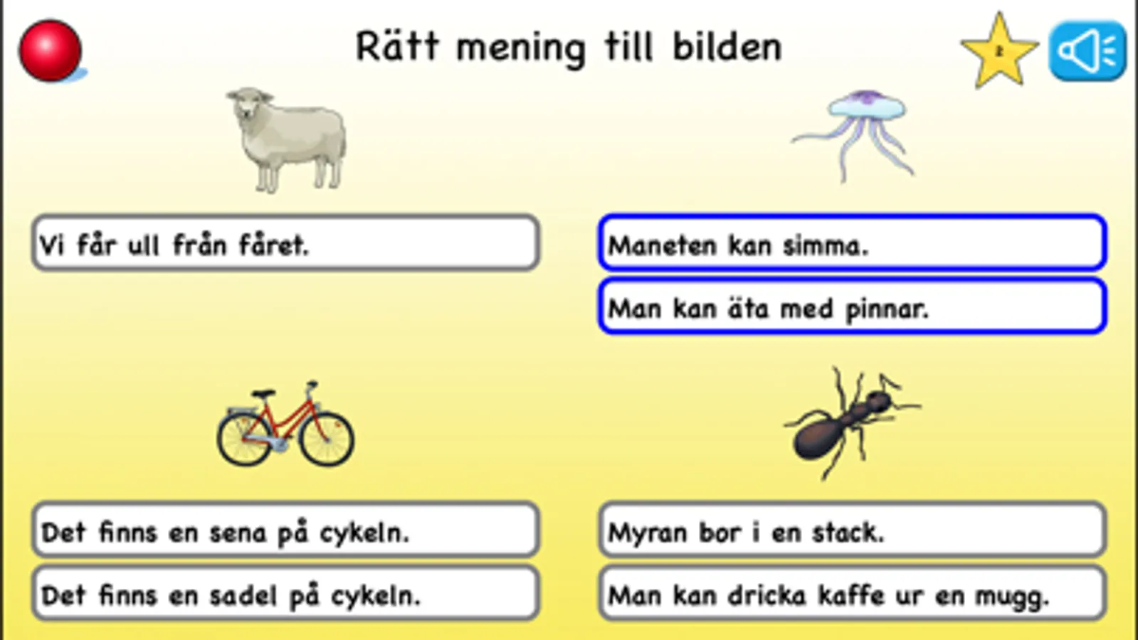 Här ges inget auditivt stöd utan meningarna i denna del skall läsas på egen hand och sedan skall man välja rätt bild till övningen.