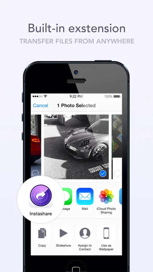 You can use Instashare with various apps thanks to the system built-in extension – share pictures from Photo library, links from Safari, and other files straight from 3rd party apps.