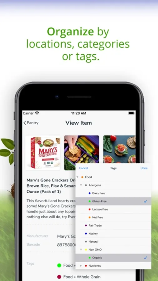 Tag with builtin (and custom) colors and hierarchy to create outfits. Stay on top of food preferences by tagging purchases organic, kosher or paleo.