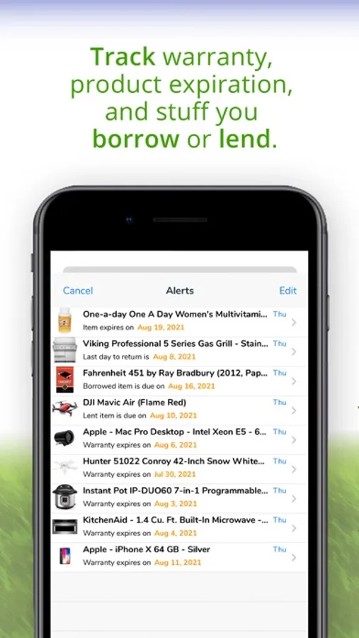 Generates alerts for warranty expiration. Save money and reduce pantry waste by using expiration alerts.