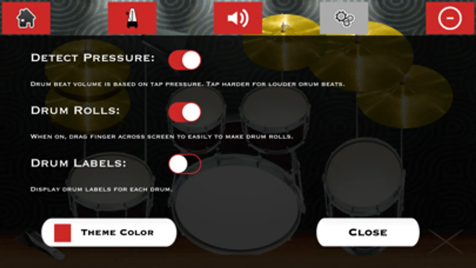 This is the best drum kit available, and its free! With rich sound and incredible response, these drums sound and feel like the real thing. Hit the drums harder for louder sounds, or lightly for quiet beats. Play the snare drum traditionally, or use a sidestick technique for a more jazzy sound. You can play your hi-hat open, closed, or using the pedal for the widest range of beats. Silde your finger across the screen for easy drum rolls, or jam away with all five fingers at once!