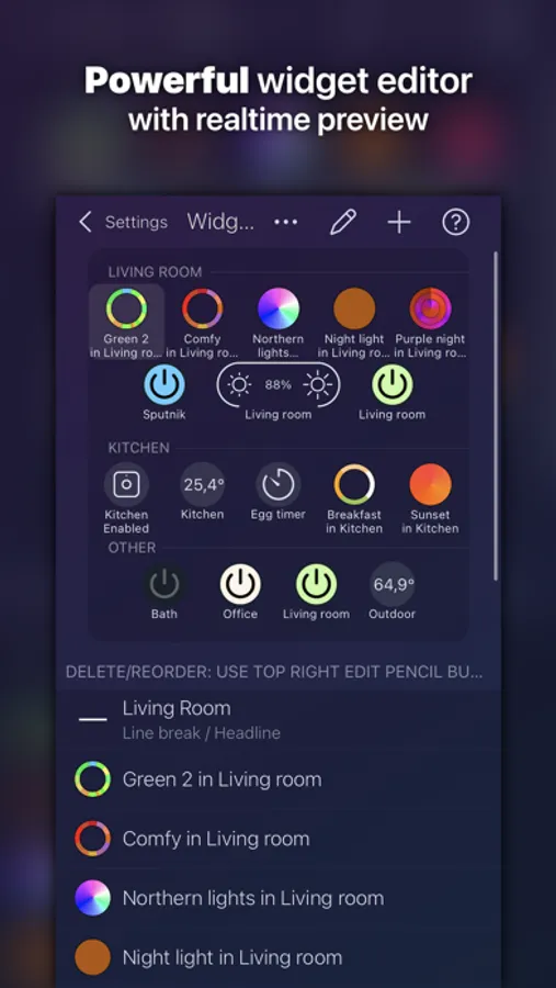 • Create the iOS widget you want! Add scenes, switches, sleep timers, reminders, light states and dimmers, motion sensor temperature & more